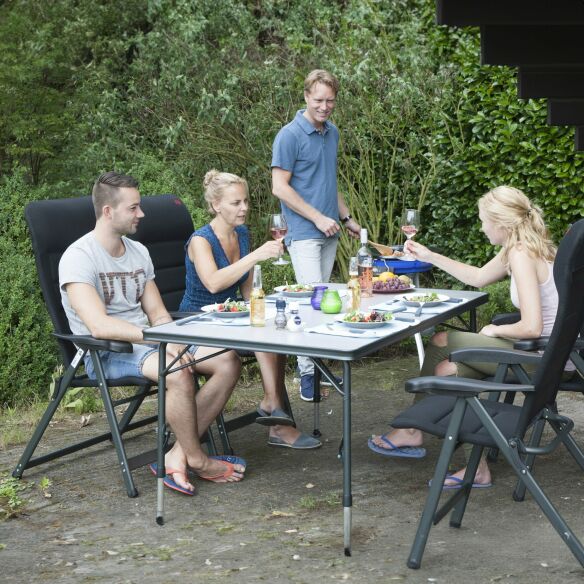 Leichter Camping-Klapptisch mit widerstandsfähiger Melamin-Tischplatte. Dank vier verstärkten, regulierbaren Tischbeinen mit 28 mm Durchmesser und seitlichen Verstrebungen ist auf jedem Untergrund ein fester Stand gegeben. Das Fixiersystem verfügt über hochwiderstandsfähige Gleitschienen. Die Epoxidbeschichtung der Aluminiumstruktur sorgt für eine noch höhere Robustheit und ist pflegeleicht.