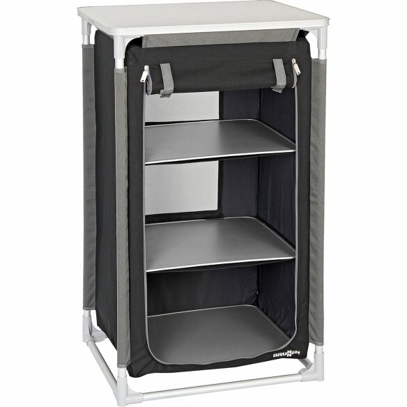 Ein vormontiertes Rahmengestänge aus Aluminium, auf das ein hochwertiger Bezug aus widerstandsfähigem Polyester aufgezogen wird, bildet das Gerüst für die in Anthrazit gehaltenen Schränke. Die abriebfesten, aus Ripstop Polyester gefertigten Gestängekanäle des Bezugs, in dem rückseitig eine Lüftungsgaze eingearbeitet ist, sorgen für schnellen Auf- und Abbau, die Ablageböden werden einfach eingelegt. Alle Drehteller-Füße sind höhenverstellbar und sorgen auch auf unebenem Untergrund für sicheren Stand. Den oberen Abschluss der stabilen Konstruktion bildet eine Ablageplatte. Eine praktische Trage- und Aufbewahrungstasche gehört zum Lieferumfang.