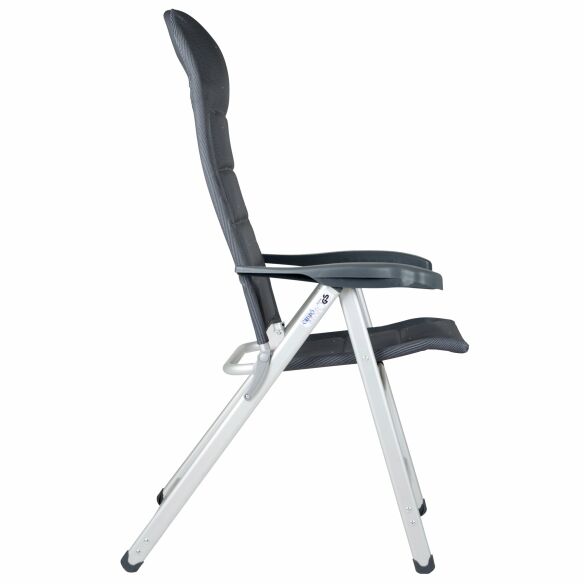 Die ergonomische Rückenlehne mit integriertem Kopfpolster ist 7-fach verstellbar. Außerdem ist der Stuhl durch sein verstärktes Aluminiumgestell bei einem sehr geringen Packmaß sehr stabil. Die rutschfesten Fußstopfen sorgen für einen sicheren Stand.