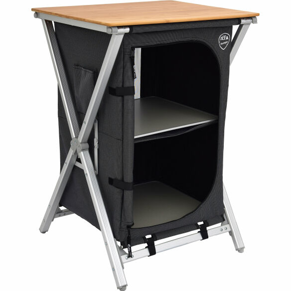 Diese schnell und leicht aufzubauenden Küchenschränke mit klappbarem Außengestell und in grau gehaltenem Bezug besitzen eine robuste Arbeitsplatte aus 10 mm starkem Bambus. Die Innenfächer können durch Herausnahme der mit einer Aluminiumkante verstärkten Regalböden individuell dimensioniert werden, eine rückseitig eingenähte Gaze dient der Belüftung. Eine Trage- und Aufbewahrungstasche ist im Lieferumfang enthalten.