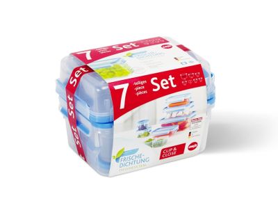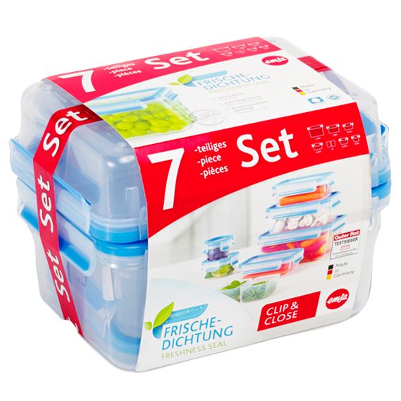 Dank transportsicherem Clipverschluss zu 100 % dicht, nicht nur bei Flüssigkeiten ? mit Geruchssperre. Die einzigartige Dichtung ohne Zwischenräume hält die Lebensmittel länger frisch! BPA frei ? geeignet für Babynahrung. Mit EMSA Frischedichtung. Platzsparend ineinander stapelbar. Mikrowellengeeignet. Ideal für den privaten und professionellen Einsatz. Set beinhaltet: 0,15; 0,25; 0,55; 0,55 (mit Einsätzen); 1,00 und 2,3 Liter. Made in Germany.