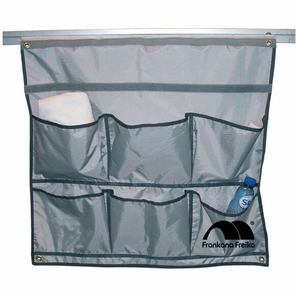 Mit 6 großen Taschen, an der Vorderseite ist ein Klettband angebracht, mit dem man eine Schlaufe bilden kann um die Tasche z. B. auch an das Zeltgestänge zu hängen; Maße B 70 x H 65 cm.