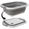 Dieses praktische Küchenaccessoire kann als stabiles Schneidebrett und als platzsparende, zusammenfaltbare Schüssel mit integriertem Wasserauslauf verwendet werden.