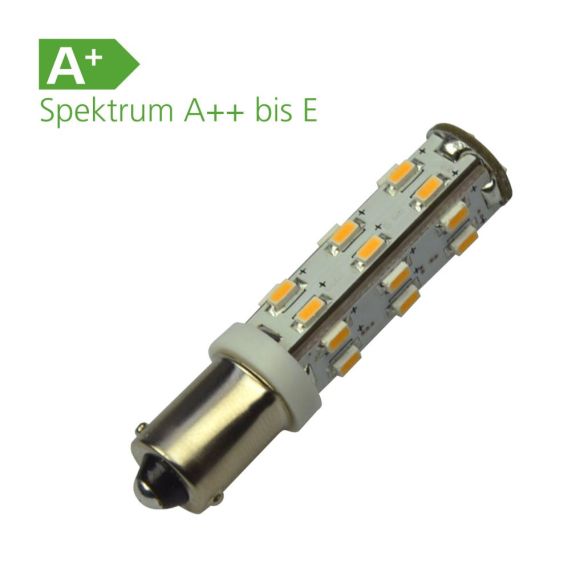 Spannung 12 V, 24 V Energieeffizienzklasse A+ Farbe warmweiß Lumen 146 lm Verbrauch (Leistung) 1,3 W Leuchtwinkel 300° Sockel BA9s dimmbar ? ersetzt Leuchtmittel 20 W Durchmesser 11,2 mm Länge 46,6 mm Gewicht 5 g