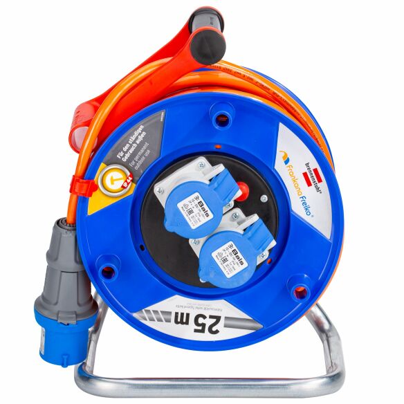 Die extrem kleine CEE-Kabeltrommel für den ständigen Einsatz im Außenbereich (IP44), mit 2 CEE-Steckdosen, 25 m H07BQ-F2,5 in der Signalfarbe orange ist extrem robust, ölbeständig und besonders geeignet für den Campingplatz. Mit 1-poliger Sicherheitsabschaltung und Überhitzungsschutz. Mit praktischem Cable Pilot: Pendelgriff sorgt für freie Hände beim Transport, praktisches Aufhängen und superschnelles Ab- und Aufrollen.