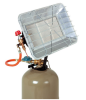 Strahler mit Schlauch und Regler, regelbar bis ca. 4200 Watt, mit thermoelektrischer Zündsicherung, fest mit der Flasche zu verschrauben. Verbrauch: ca. 336 g/h; 50 mbar.