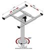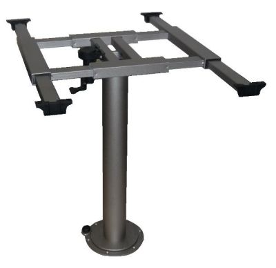 Höhe bis Unterkante Tischplatte 70 cm. Tischverschiebung mit einer zentralen Verriegelung. Quer- und Längsverschiebung um 21,5 cm und 38 cm. Tischverdrehung um 360° mit einer Fußrastung in Nullposition. Sockelplatte mit 6 Löchern zur Befestigung auf dem Fahrzeugboden. Besonders geeignet für Reisemobile und überall da, wo kein Bettbau erforderlich ist. Hohe Stabilität.