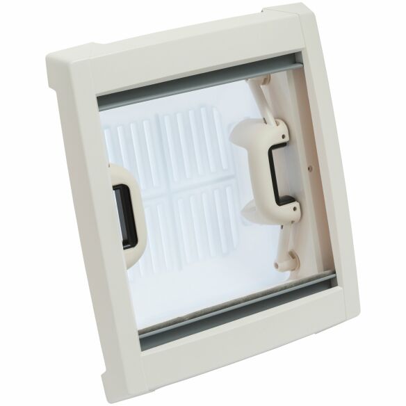 kleine, platzsparende Milchglashaube Teleskop-Aussteller, vierseitig aufstellbar Aussteller mit Verriegelung Innenhaube mit Dauerlüftungmit abklappbarem Netzrahmen
