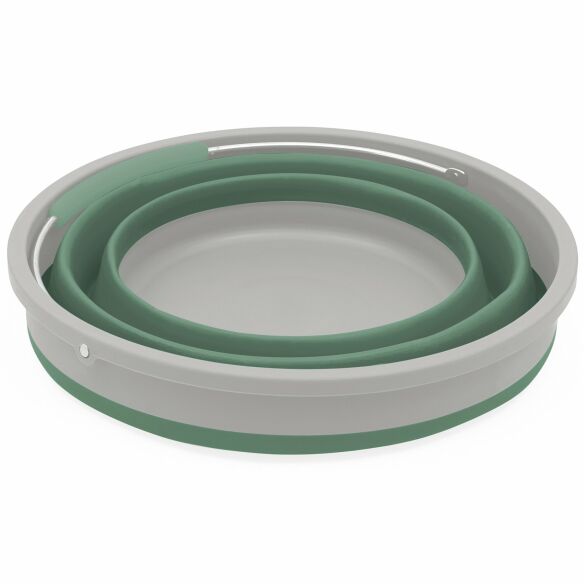 Falteimer mit Deckel und Griff. Kann sehr flach gefaltet werden und hat gefaltet eine Höhe von gerade einmal 5,5 cm.